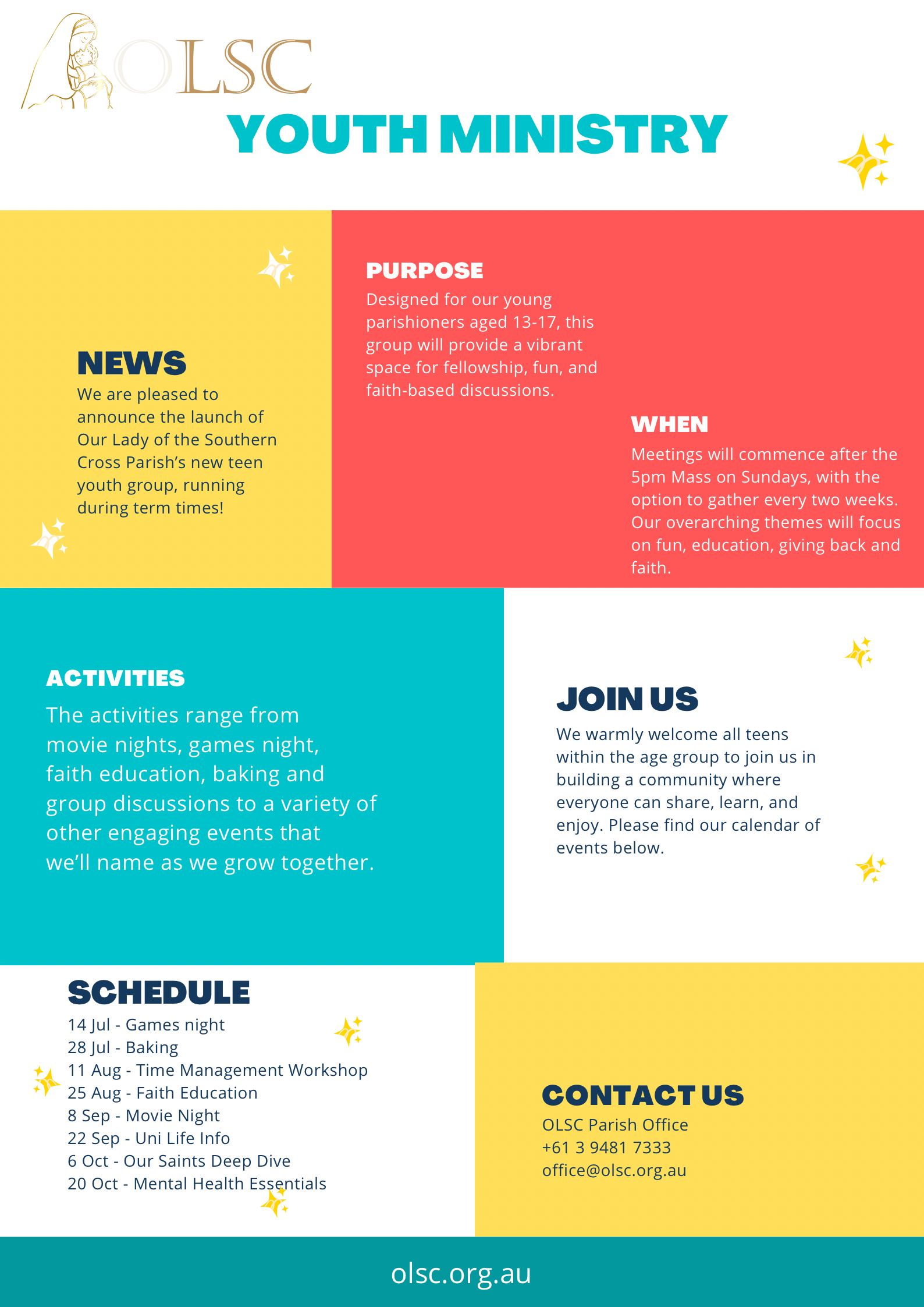 We are pleased to announce the launch of Our Lady of the Southern Cross Parish’s new teen youth group, running during term times!